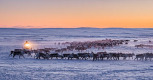 Saamelainen laulaja joikutaiteilija Ingá-Máret Gaup-Juuso esiintyy Oulun Yliopiston luentosalissa 23.2.2026. Musiikkiesityksen taustalla on Jyrki Kallio-Kosken luontokuvia Käsivarren erämaasta ja Raittijärjen porokylän ihmisten elämästä yli 40 vuoden ajalta.