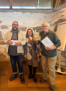 Kuva palkinnonjakotilaisuudesta. Luonnonsuojelupiirin puheenjohtaja Sauli Luttinen, Naantalin seudun luonnonsuojeluyhdistyksen puheenjohtaja Johanna Aaltonen ja Jaakko Ruola